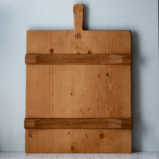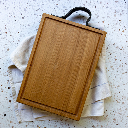 Oak Wood Handcrafted Cutting Board With Juice Grooves & Leather Handle (Large)